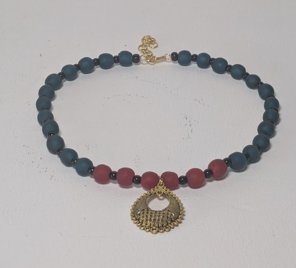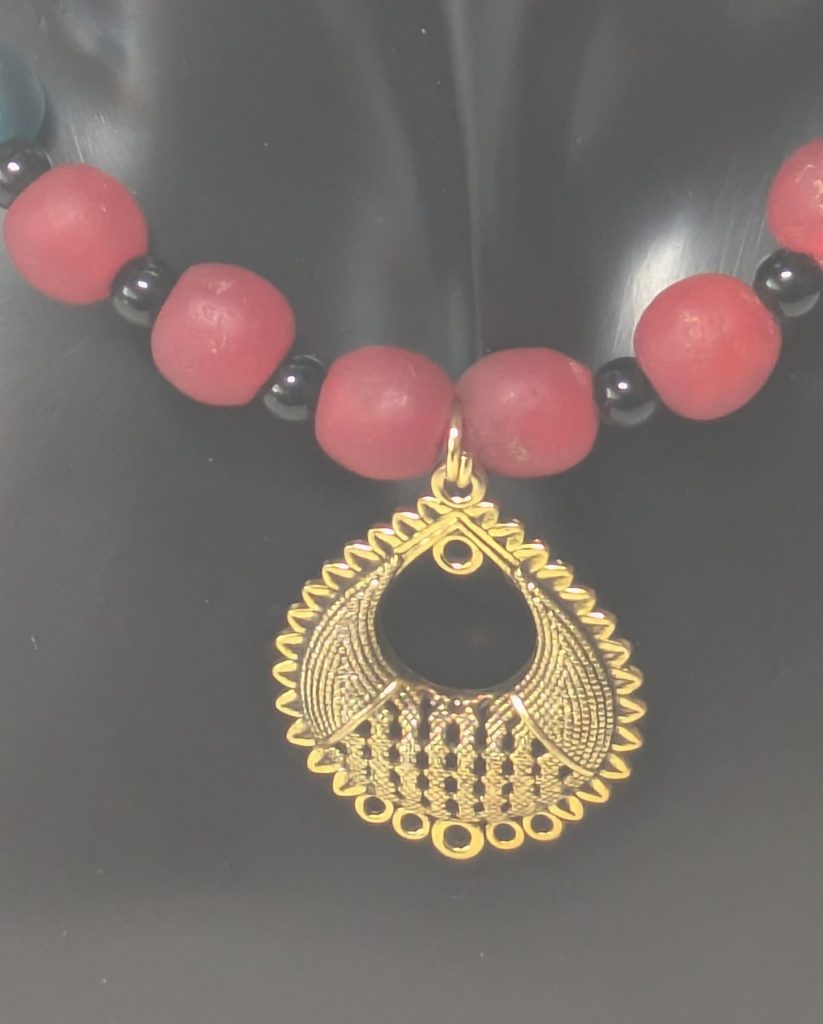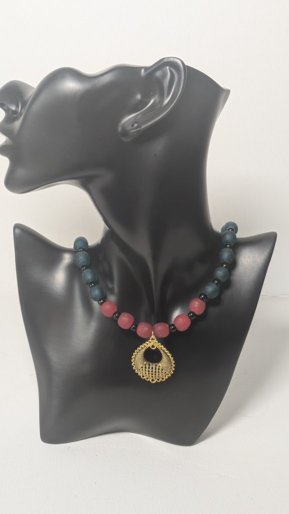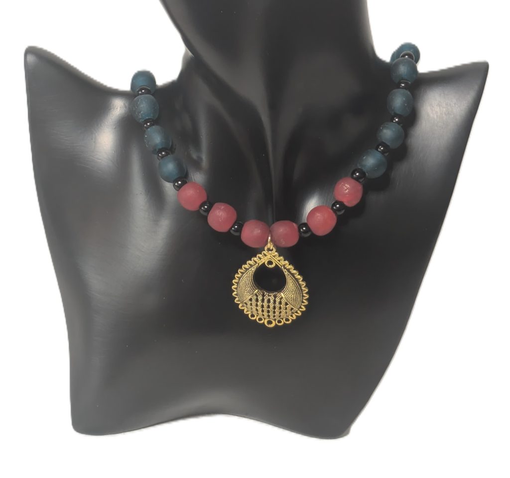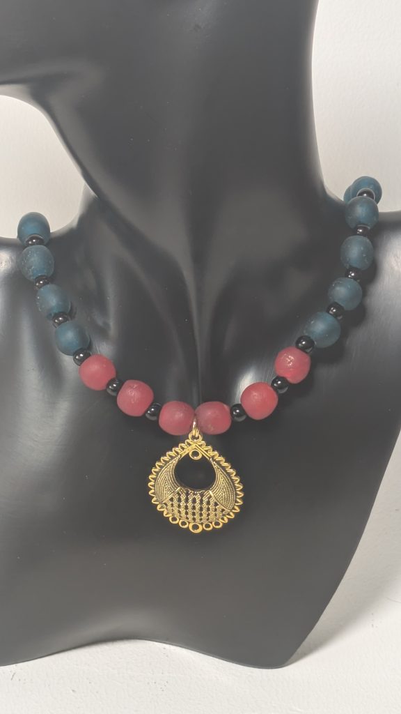 Halskette aus roten und blauen Glasperlen mit Messing-Anhänger – Handgefertigt in Kenia