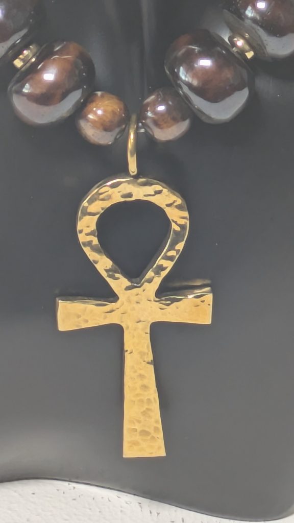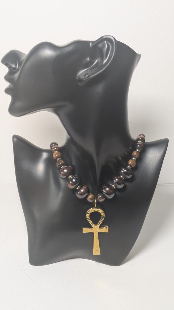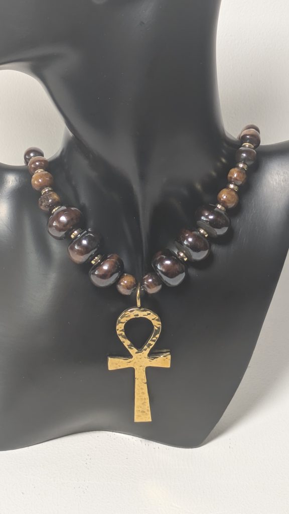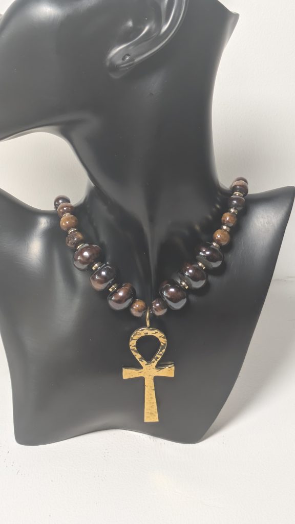 Halskette aus braunen Knochenperlen mit einem Messing Ankh-Kreuz Anhänger