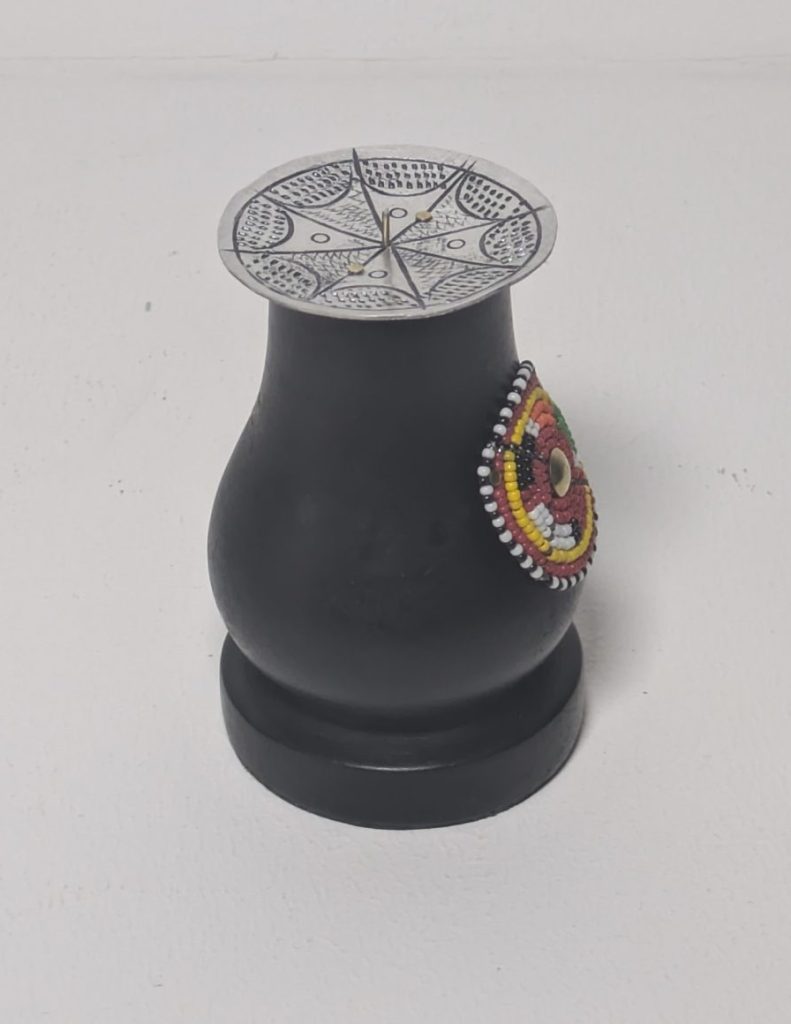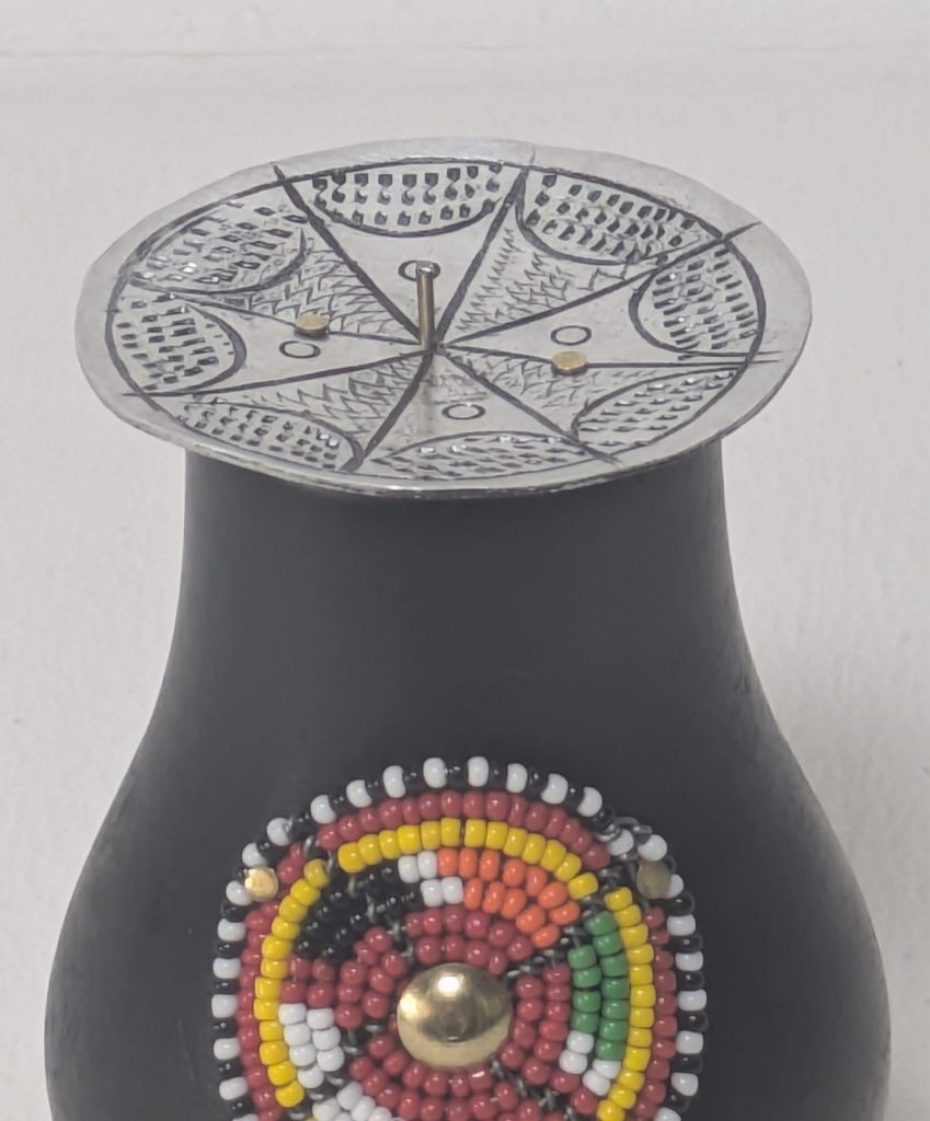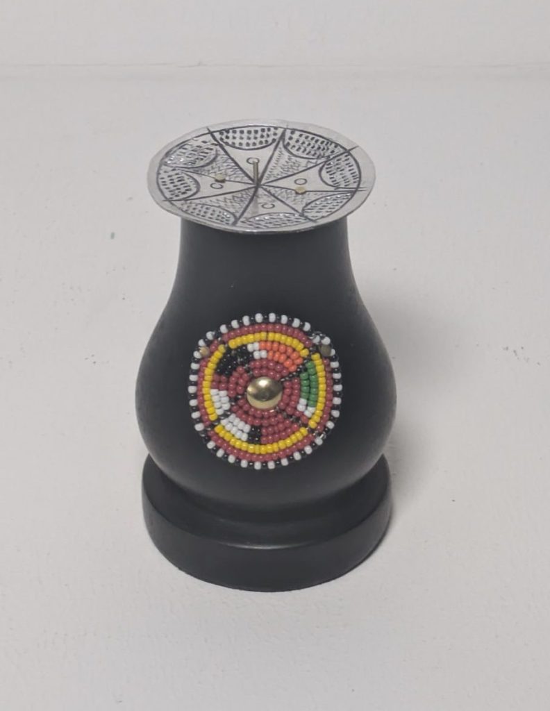 Bringen Sie Wärme, Eleganz und afrikanische Handwerkskunst in Ihr Zuhause mit diesem einzigartigen Kerzenständer. Der aus hochwertigem Jacaranda-Holz gefertigte Ständer wird durch ein kunstvolles, traditionelles Design aus Rocaille-Perlen verziert und mit einem Aluminium-Teller ergänzt, der sowohl Funktionalität als auch Stil bietet.
